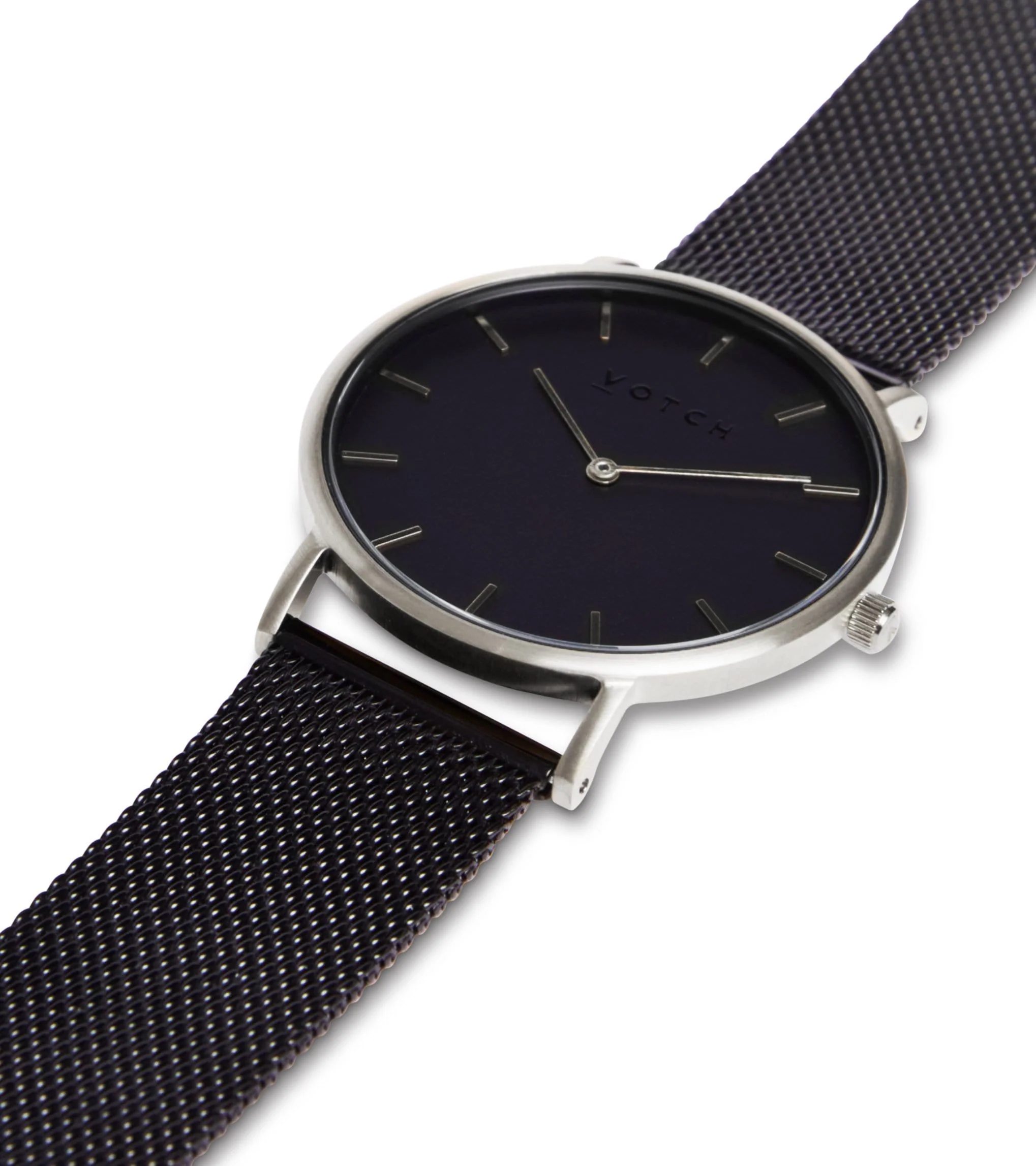 Our stunning contemporary mesh Votch is a classically striking timepiece with soft brushed metal casing and accented indexes.